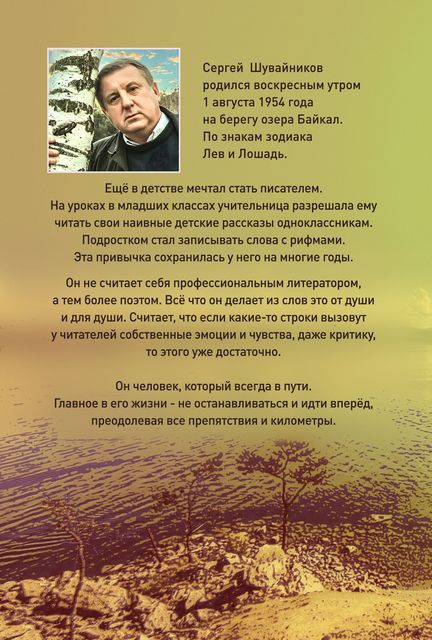 Так сложилось, что ещё в школьные годы Сергей Шувайников на отдельных листках записывал свои эмоции и чувства в стихотворной форме. Поэтому он называет себя «стихотворцем», и поэтом себя не считает. За многие годы таких листков набралось немало – автор решил сохранить их для будущего, для детей и внуков, для друзей и товарищей, для всех, кому будут интересны и близки его стихотворные строки. Недавно книга «Контуры времён прошедших» Сергея Шувайникова вышла в симферопольском издательстве «Форма» и автор решил предложить её вниманию заинтересованных читателей.
